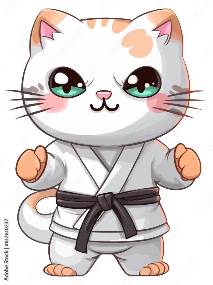 Cute cartoon cat dressed into the karate outfit and standing in karate pose