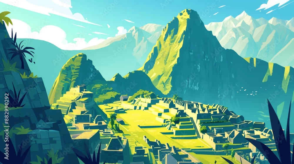 Cute cartoon landscape of the ancient Inca ruins of Machu Picchu, minimalist backgrounds, simple and colorful illustrations