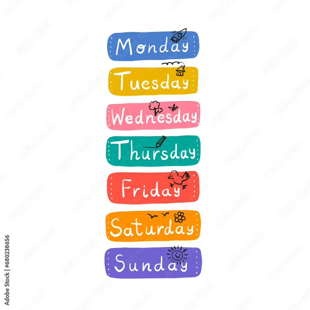 Cute fun hand written days of the week stickers for weekly planner with elements. Colourful playful days of the week lettering. Typography set, font for daily organiser, diary for kids.