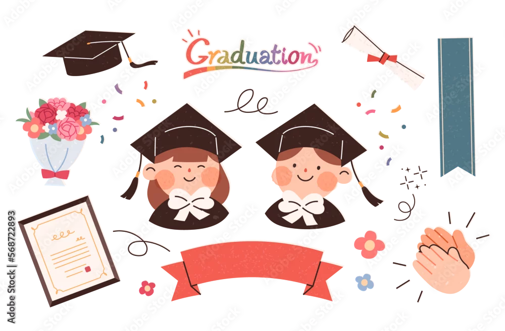Cute Graduation Elements Icon Set. Graduation ceremony concept illustration including bachelor cap, graduation gown, diploma and bouquet.