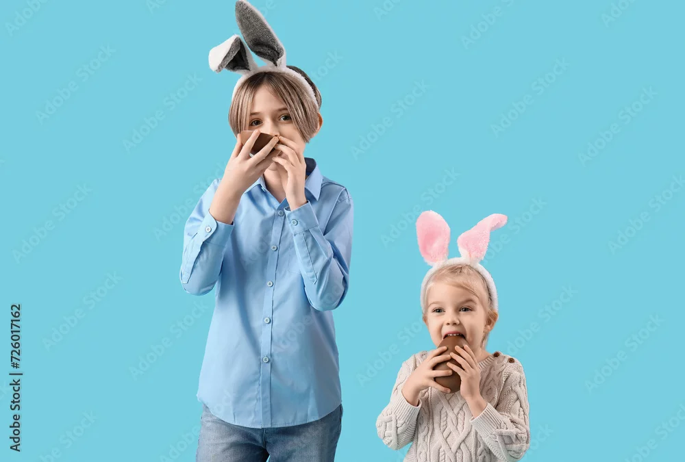 Cute little children in bunny ears eating chocolate egg on blue background. Easter celebration