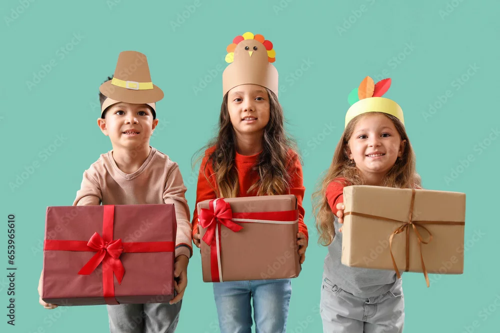 Cute little children with gifts on green background. Thanksgiving Day celebration