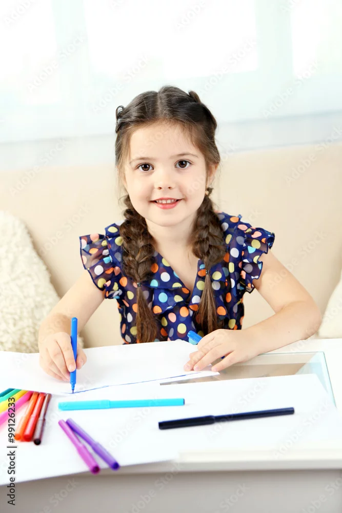 Cute little girl drawing picture on home interior background