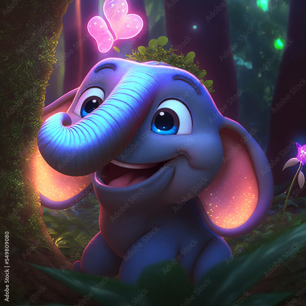 cute smiley baby elephant with mother-of-pearl tusks, neon lights dof background,epic , cinematic, sun rays, dappled shade, ferns