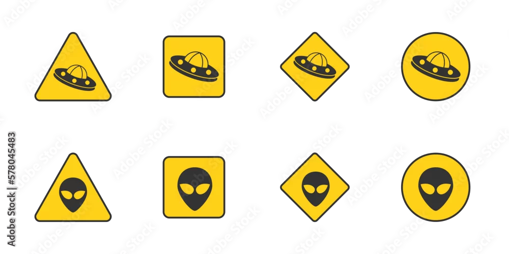 Danger UFO sign set. Aliens warning road signs. Flat vector illustration.