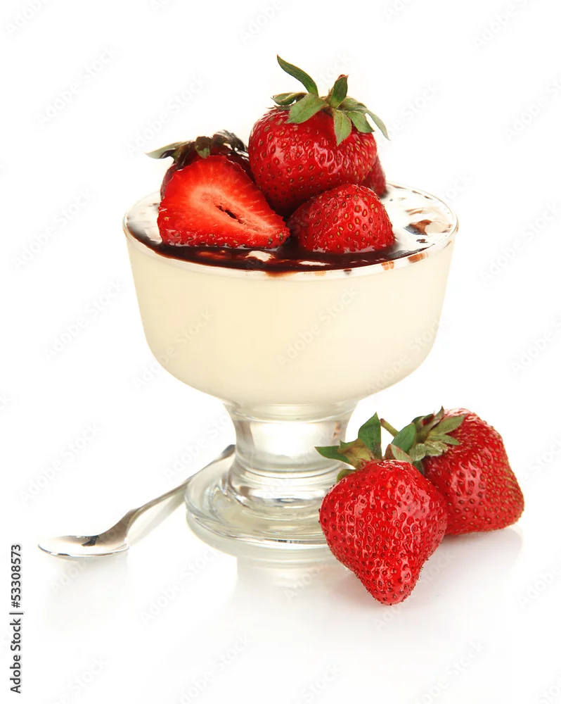 Delicious strawberry dessert in glass vase isolated on white