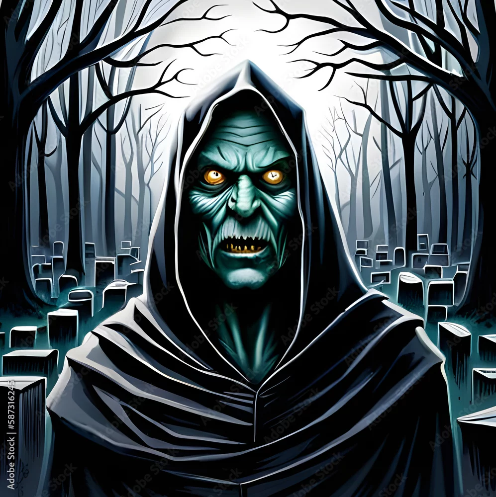 Demon na cmentarzu. Ilustracja Helloween, horror. Wygenerowana przez AI.