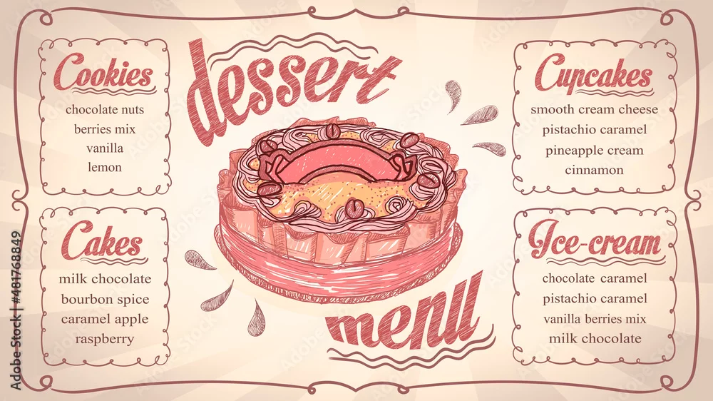 Dessert menu list template with cupcakes, cakes, ice-cream and cookies lettering