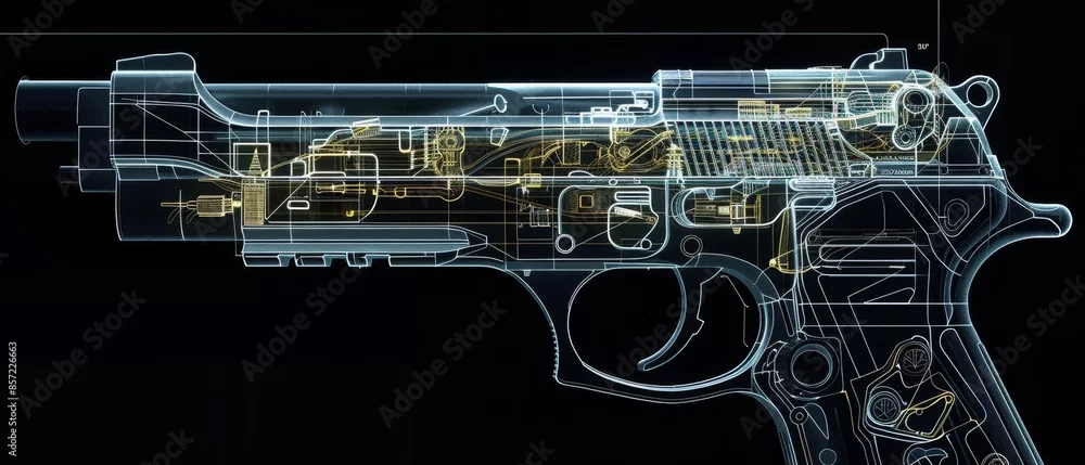 Detailed AutoCAD Diagram of Gun Mechanism on Black Background for Engineering and Design Concepts