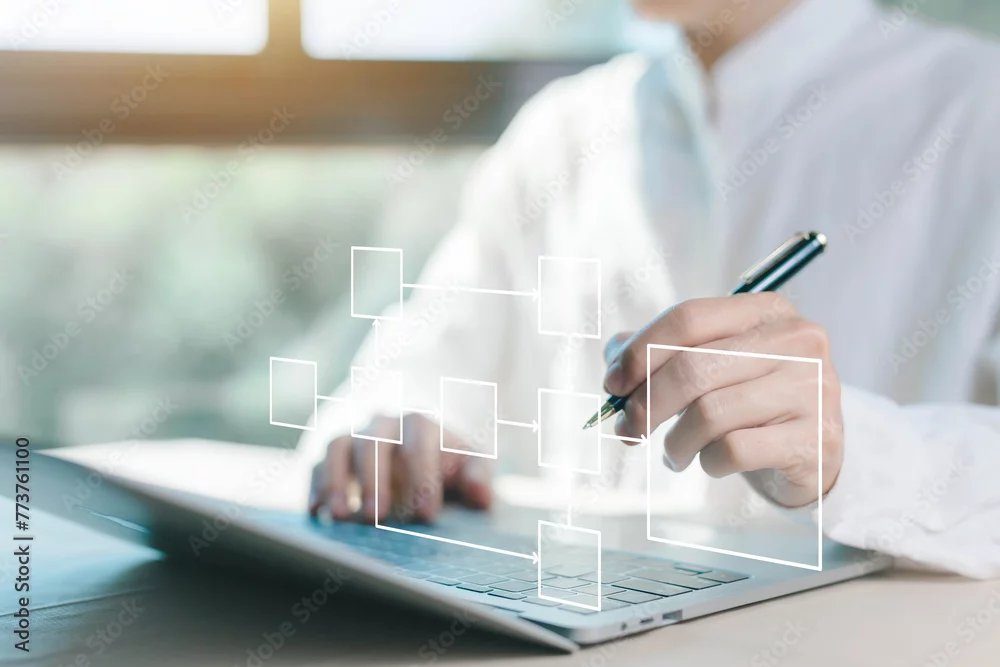diagram algorithm flow, organigram on a computer, and hierarchy scheme. design workflow automation with flowcharts. model structure digital and data management and Business process