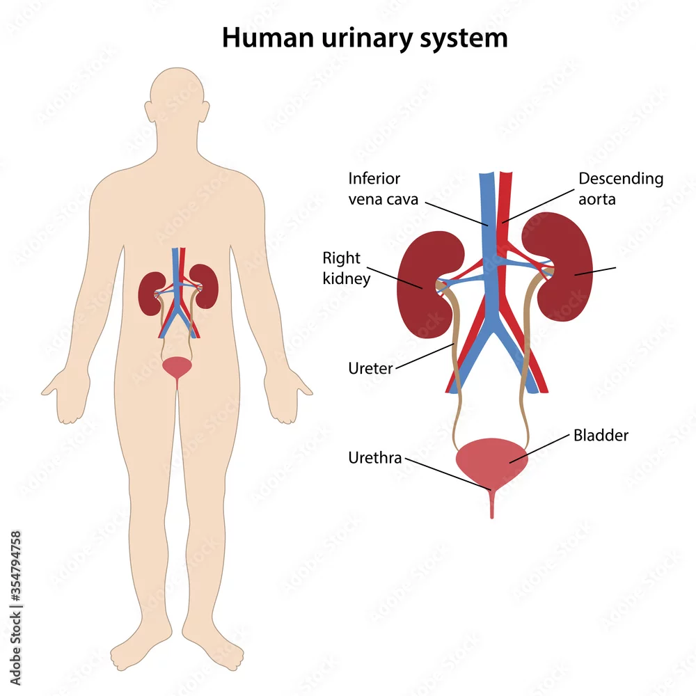 Diagram of human urinary system with main parts labeled. The location of the urinary system in the human body. Medical vector illustration in flat style ...