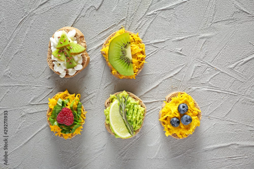 Different tasty sandwiches on grey background