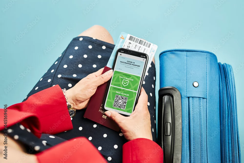 Digital covid certificate. Covid vaccination digital pass. Woman passenger holding digital medical pass on her mobile phone, passport and airplane ticket. Traveler showing digital covid test result