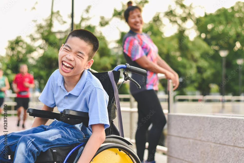 Disabled child on wheelchair is play and learn in the outdoor park like other people, Life in the education age of special children, Happy disability kid ...