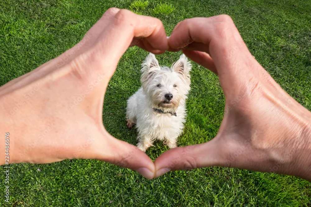 Dog looking adoringly at owner who is making heart shape with hands - cute west highland terrier westie pedigree