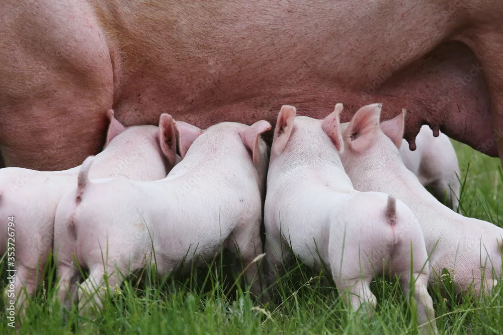 Domestic pig suckling on fresh grass on meadow