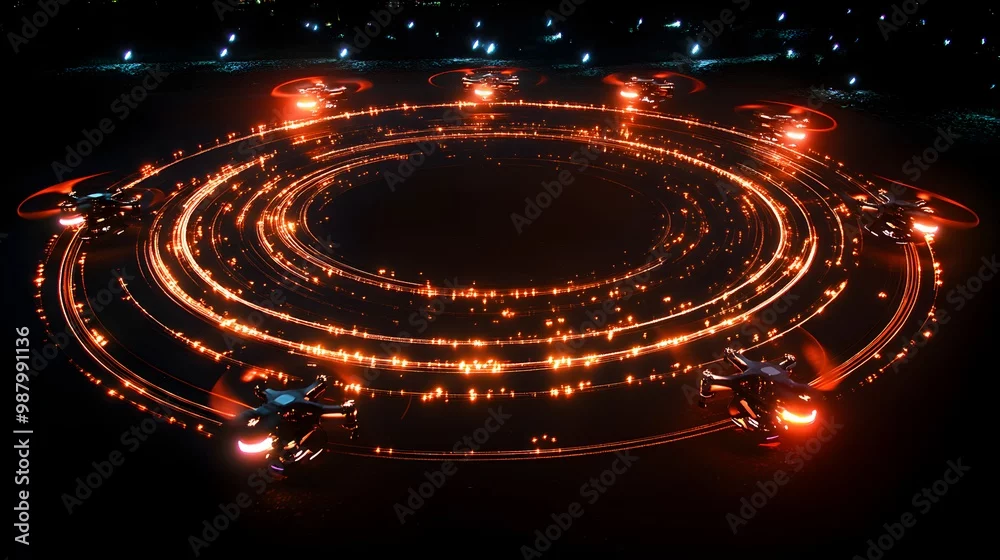 Drones in a circle, performing synchronized aerial maneuvers, creating mesmerizing light trails, a high-tech demonstration of cutting-edge flight tec ...
