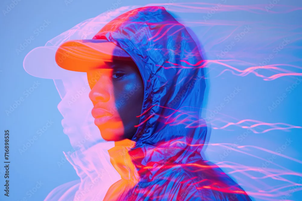 Dynamic double exposure portrait of a young black man. Generative AI image