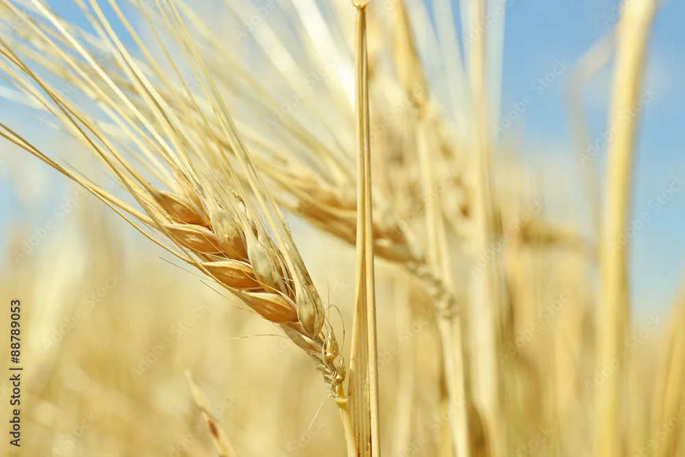 Ears of wheat on blue sky background