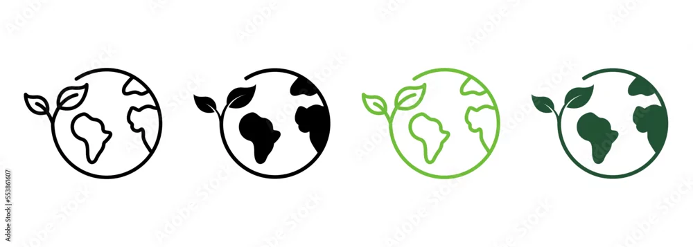 Earth Nature Care Line and Silhouette Icon Set. Ecology Planet and Leaf Pictogram. Eco Globe Green World with Plant Symbol Collection on White Background. ...