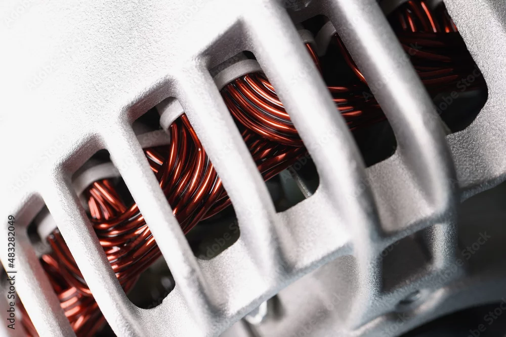 Electric motor stator with winding coil, view of inside of electric induction motor