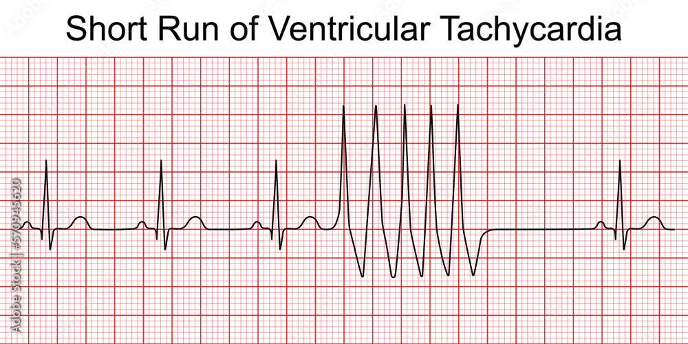 Electrocardiogram short run of ventricular tachycardia (VT). Cardiac fibrillation. Heart beat. ECG. EKG. Vital sign. Life support. Medical healthcare ...