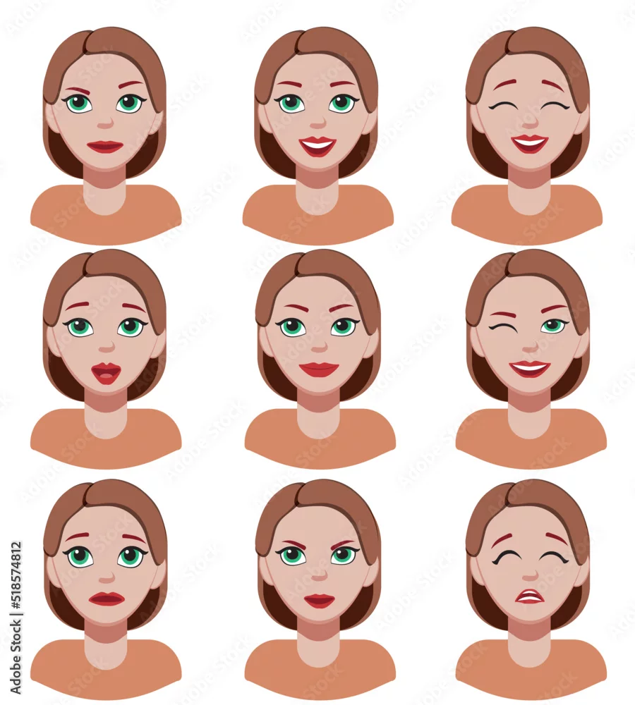 Emotions girl. Face expressions. Different female emotions, set. Attractive cartoon character. Vector illustration isolated on white background.