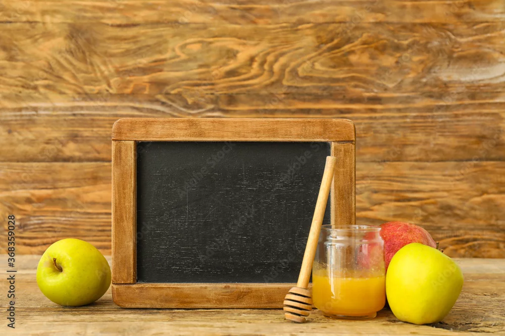 Empty chalkboard with fruits and honey on wooden background. Rosh Hashanah (Jewish New Year) celebration