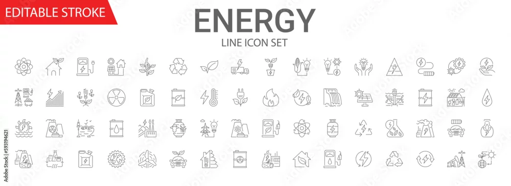 Energy related vector linear icon set. Energy industry. Electricity manufacturing technologies and modern facilities. Vector outline illustration Isolated ...