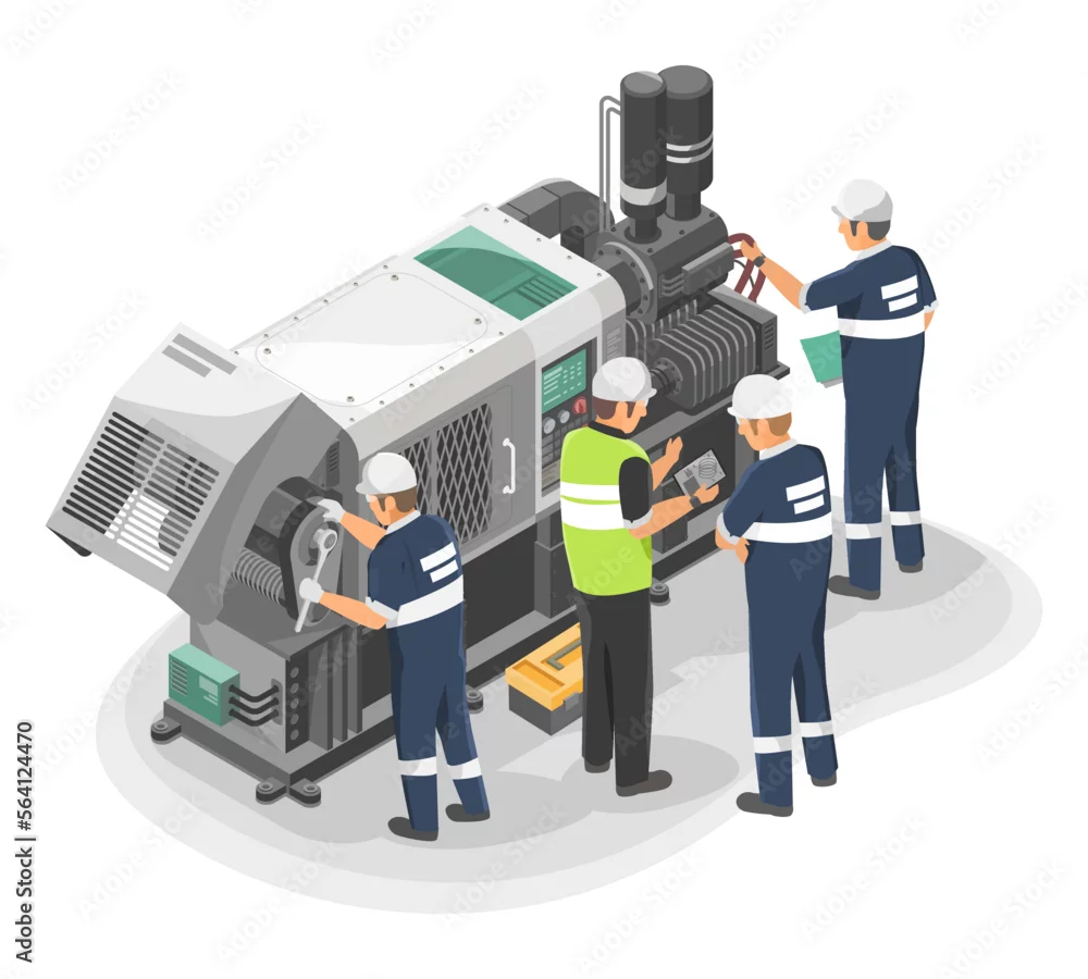 Engineer Maintenance failure machine isometric Grey Machine industrial employee worker fixing in factory element on white background illustration isometric ...