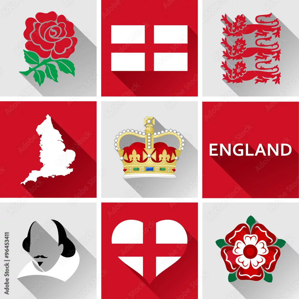England Flat Icon Set. Set of vector graphic flat icons representing landmarks and symbols of England.