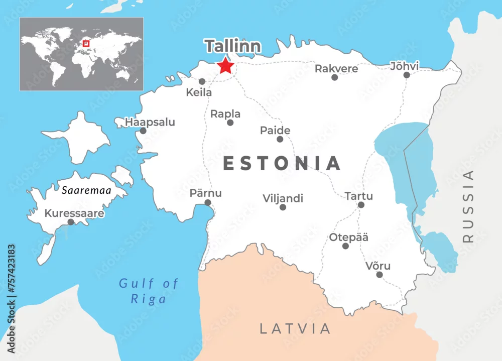 Estonia Political Map with capital Tallinn, most important cities and national borders