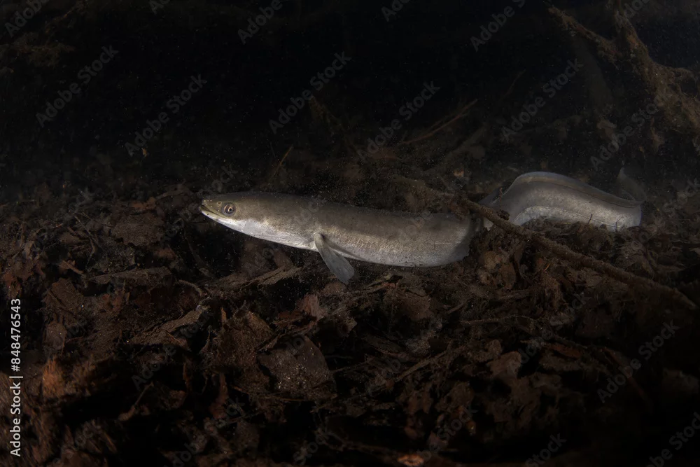 European eel is hiding on the bottom. Eel in freshwater. Nightdive in the lake. Rare fish looks like snakes.