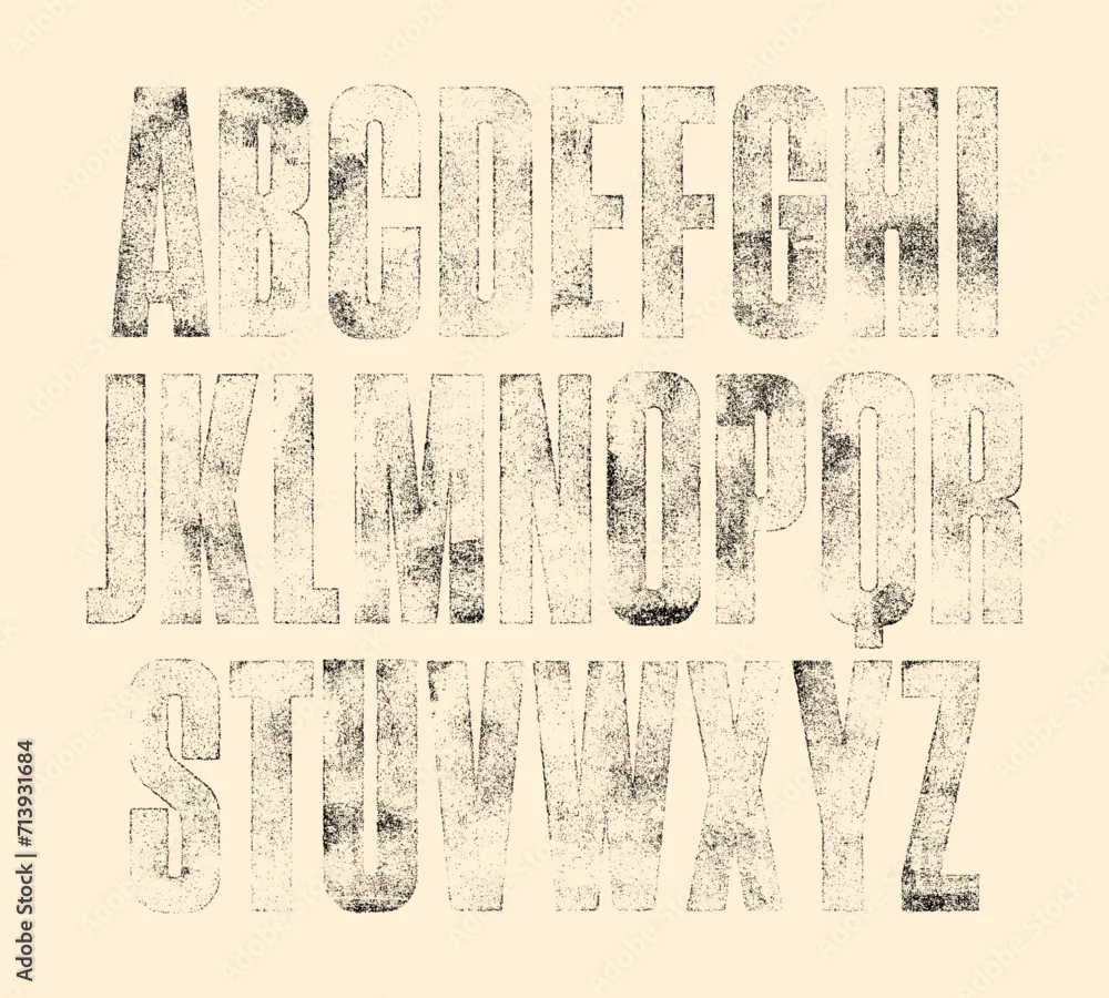 Faded, worn ink texture font (Lighter version). Highly detailed hand textured characters with a faded, rough, rolled ink print texture.