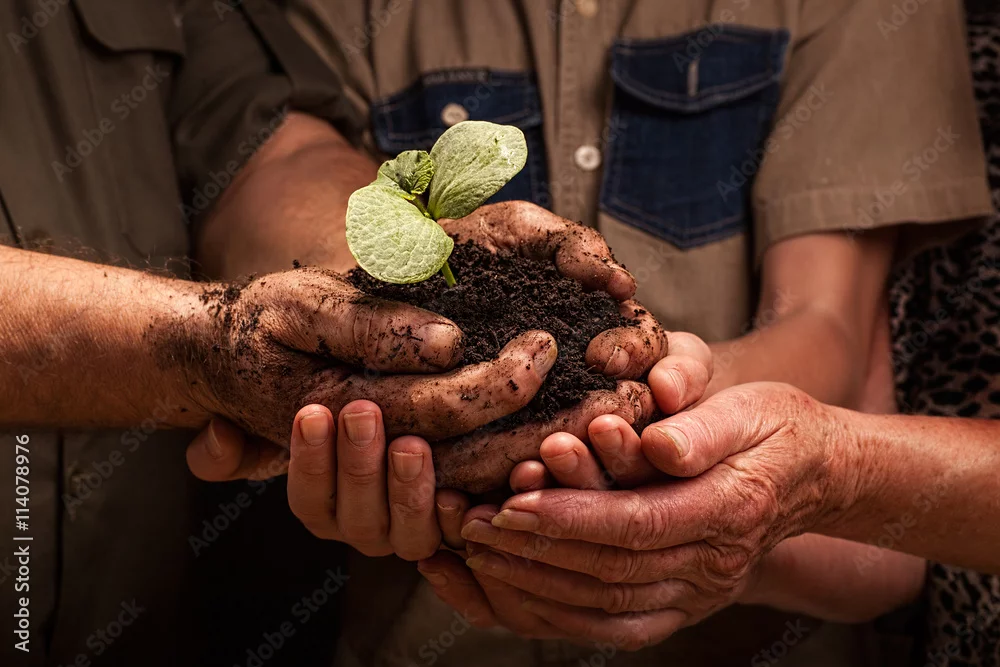 farmers family hands holding a fresh young plant