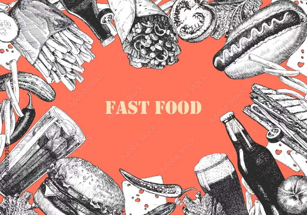 Fast Food Menu. Hand-drawn illustration of dishes and products. Ink. Vector