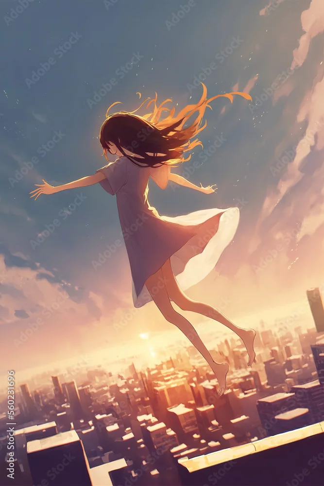 feeling free and flying, anime girl flying over a city, peaceful manga artwork, generative ai technology