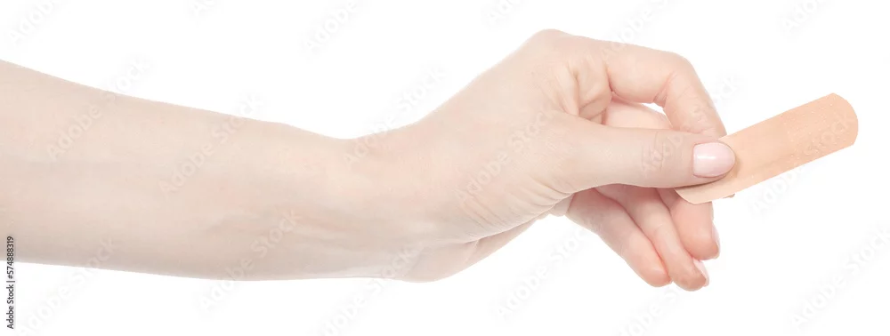 Female caucasian hands sticking medical adhesive wound plaster isolated white background. Woman hands with surgical tape showing different gestures. first ...
