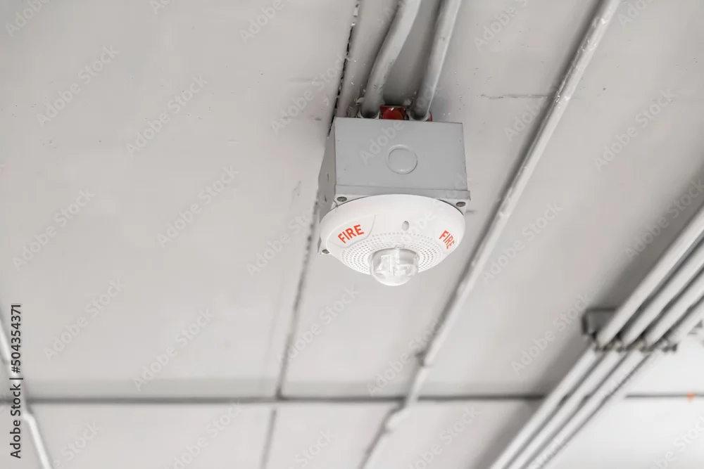 fire detector at ceiling, smoke and flame alarm sensor in commercial building safety equipment