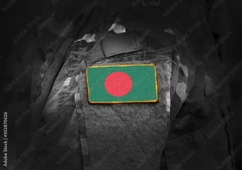 Flag of Bangladesh on military uniform. Army, troops, soldiers. Collage.