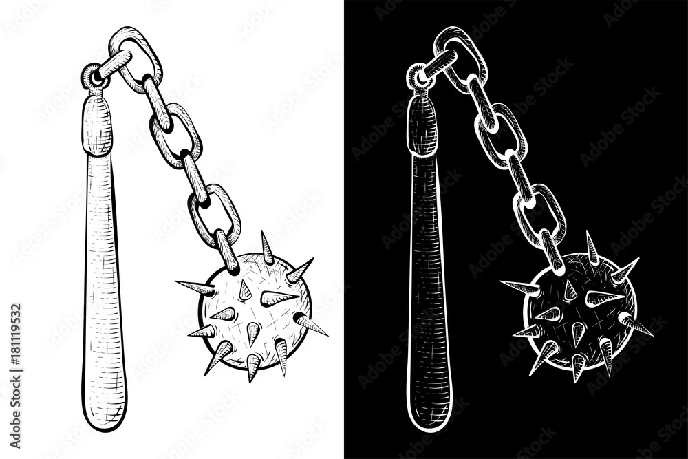 Flail. Medieval weapon - spiked metal ball with chain and wooden handle. Hand drawn sketch