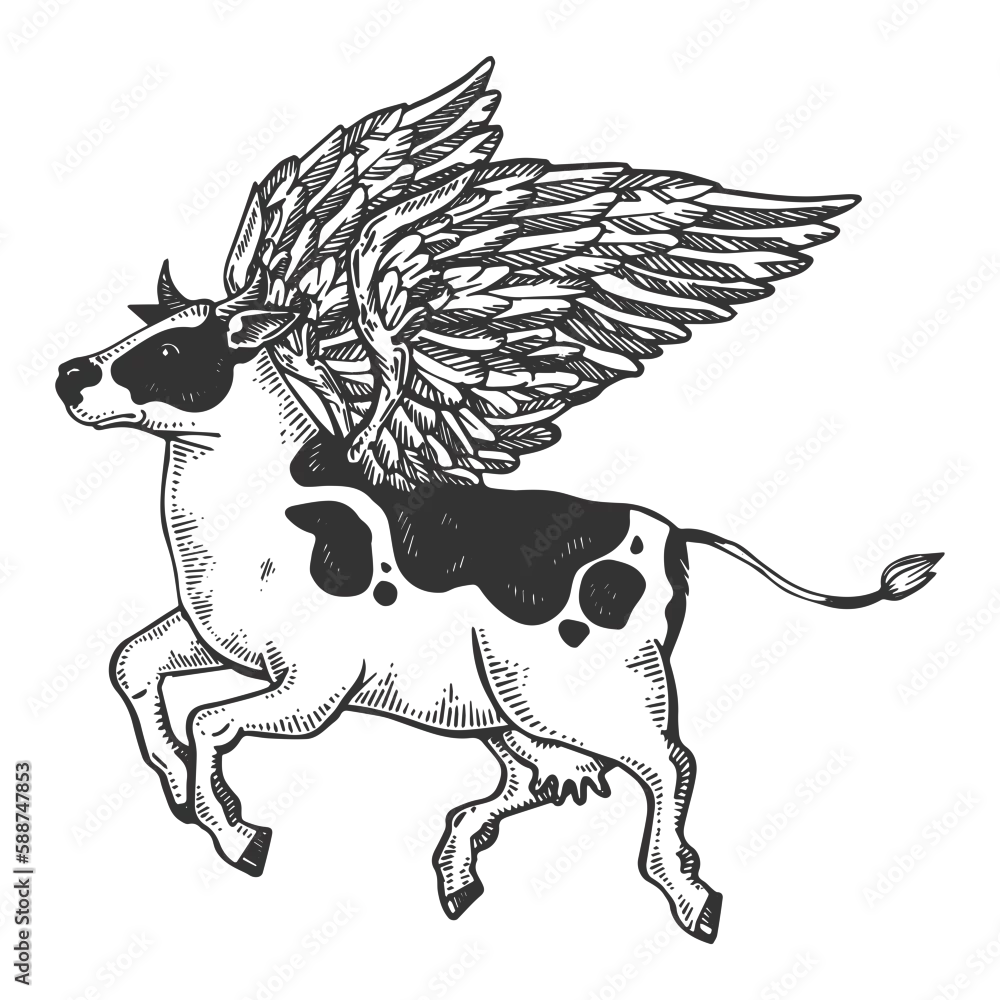 Flying cow farm animal engraving PNG illustration with transparent background