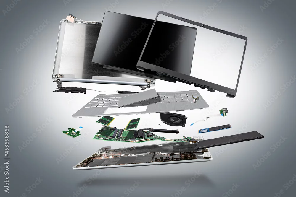 flying parts of a notebook computer. hardware components mainboard cpu processor display RAM cables and cooling fan flying out of silver laptop PC case ...