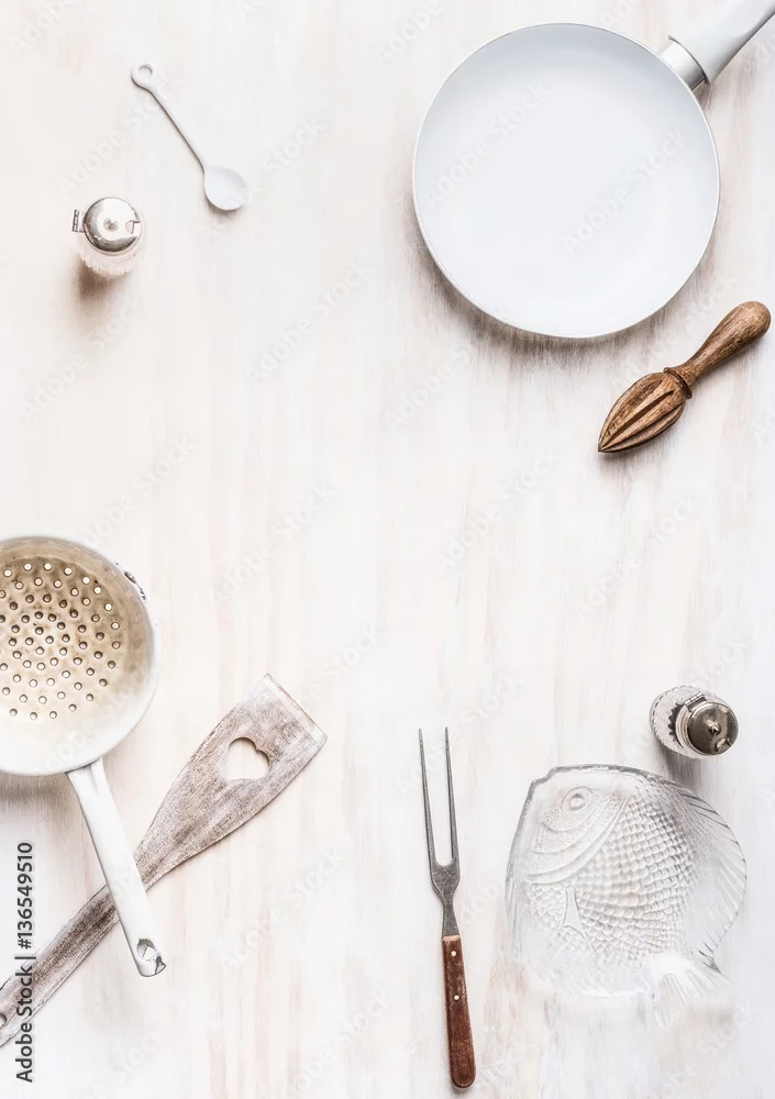 Food background with empty frying pan, cooking spoon, colander and bowls on white kitchen table, top view, frame