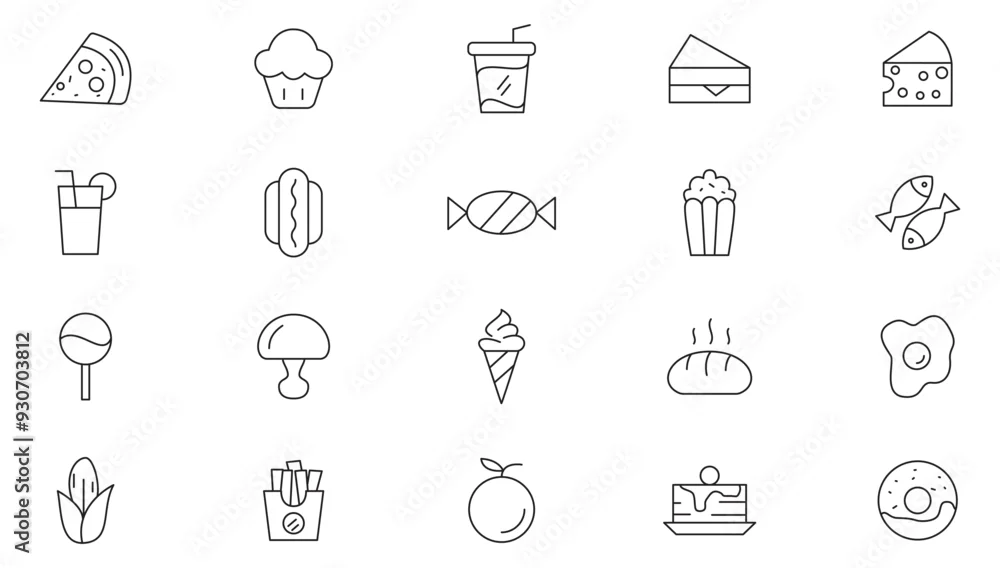 Food line icon collection. Fast food, drinks, bar, restaurant, meal, fruits, eat, coffee and healthy food icon set. UI outline icons pack.