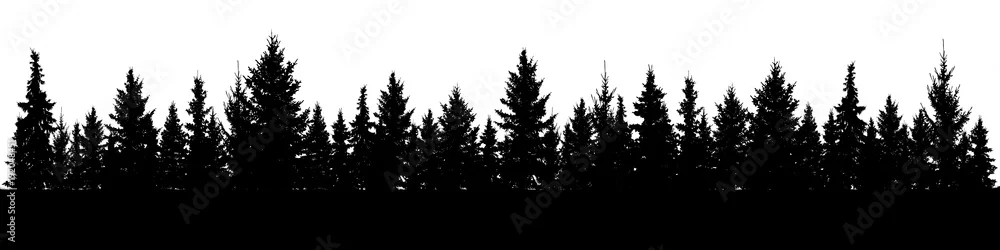 Forest of Christmas fir trees silhouette. Coniferous spruce panorama. Park of evergreen wood. Vector on white background