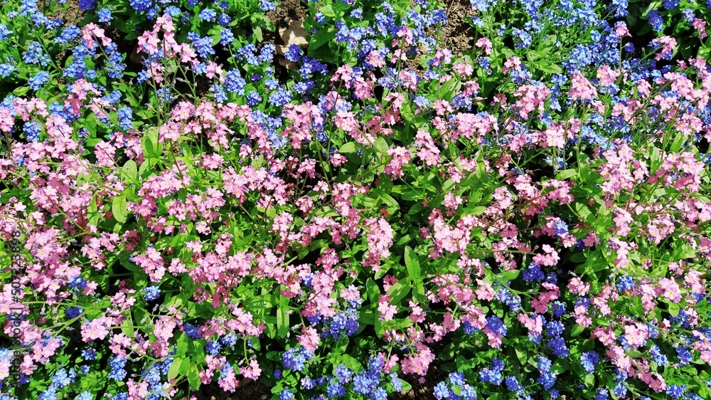 Forget-me-nots. Myosotis flowering plants in the family Boraginaceae. Forget-me-nots or scorpion grasses. Myosotis alpestris small flowers for decorating lawns and flower beds. Garden landscaping.