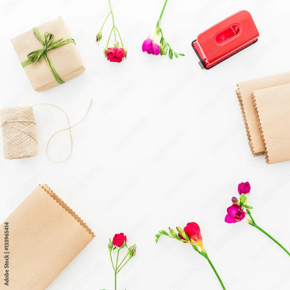 Frame with red flowers, gift box and details isolated on white background. Flat lay, Top view.