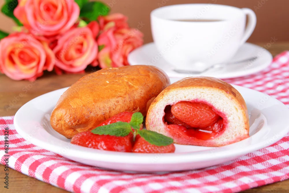 Fresh baked pasties with strawberries on plate on table