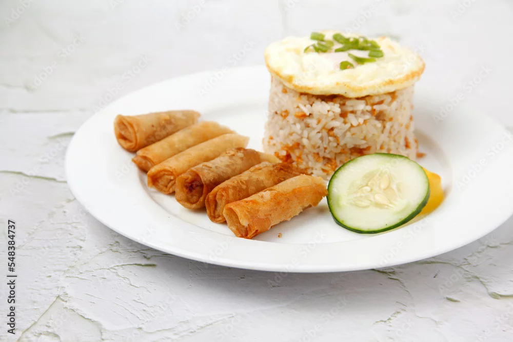 Freshly cooked Filipino food called Shanghai Silog or fried spring roll, egg and fried rice